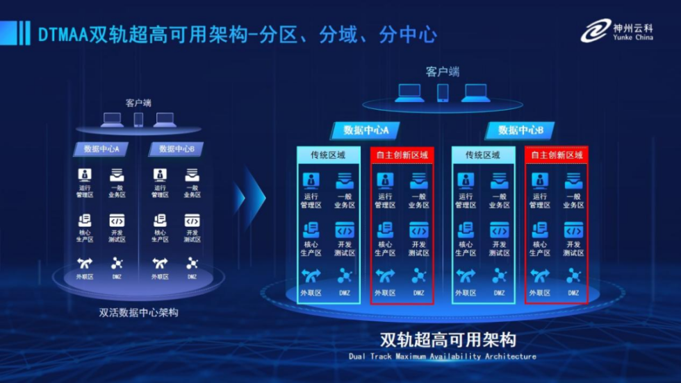 为帮助金融客户更好地应对数字经济时代对可持续性的高要求,实现“信创”与“数字化”齐头并进,kaiyun开云电竞推出了双轨超高可用架构。该架构在双活数据中心的分区调度基础上,增加信创域和非信创域的分域调度,实行信创域与传统域应用全量部署,使双中心运营变为双中心四区域并行运行,互为多活,将“0到1”的单轨建设道路变为分区分域协同的多活双轨超高可用架构。帮助客户在新架构下,保障“信创”的同时解决性能瓶颈,提升稳定性,保证应用可持续性,最终实现信创区域和非信创区域的平滑过渡,完成国产化替代目标。